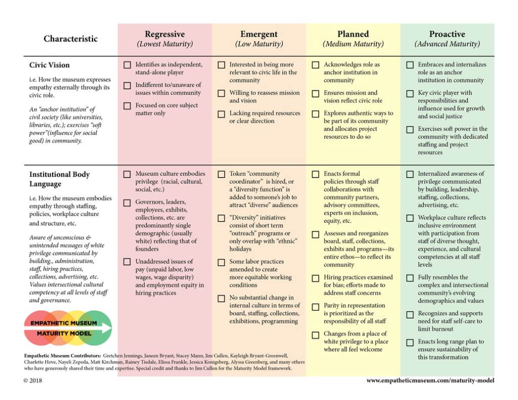 The Empathetic Museum. [@empatheticmuseum] (September 18, 2021). “In response to our last post, check out Gretchen Jennings “Can Museums Be Empathetic? Yes” [Table: Empathetic Museum Maturity Model detail]. Instagram. https://www.instagram.com/p/CT-4g5VJTe2/