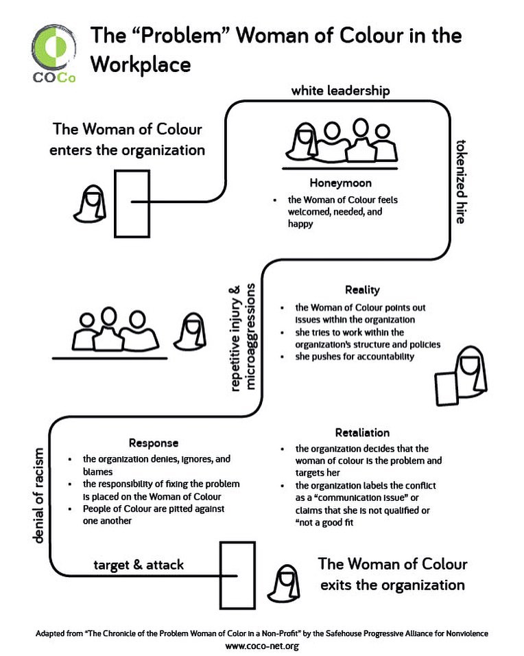A couple a years ago, COCo discovered an earlier version of this tool, which depicts a common experience for women of colour (especially Black women) working in the non-profit sector. The diagram, which was originally developed in the United States, really struck us. It spoke to many of the stories employees in the nonprofit sector had told us about their own experiences; it also told the ‘story’ of much of the data we were collecting ourselves as part of our Diversité d’Abord research project.