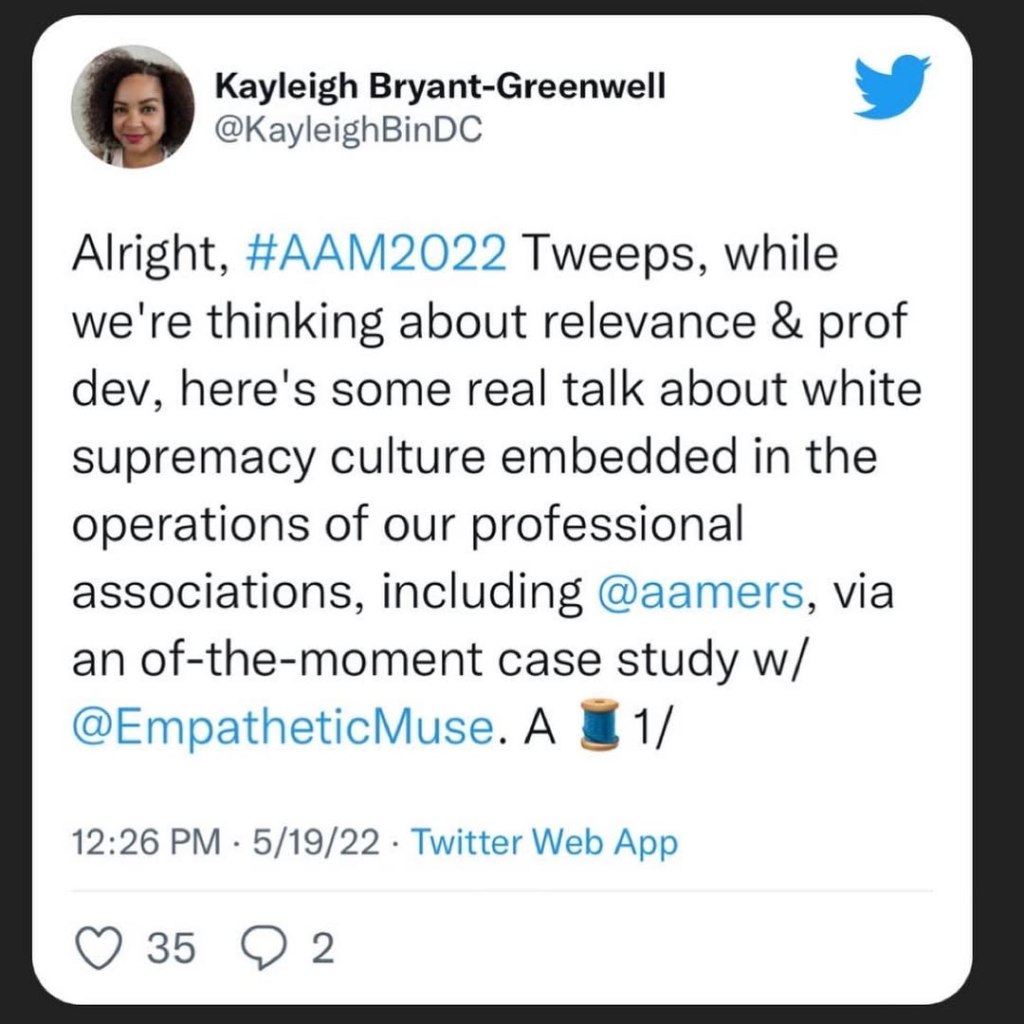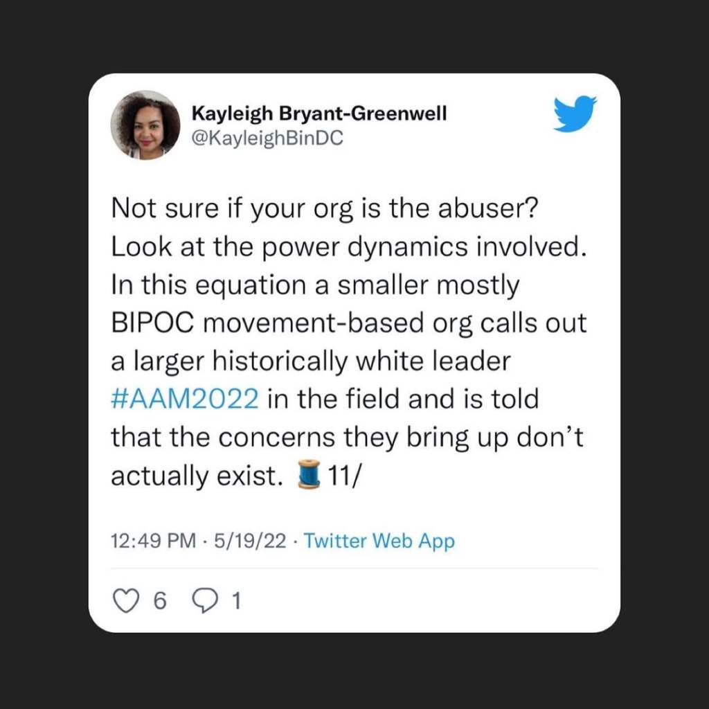 Thank you to our member, @kayleighbindc, for so eloquently calling out the harmful behavior of organizations like @aamersofficial that seek to erase, gaslight and detract from original work; work being done by mostly Black and BIPOC women in the empathetic and social justice in museums fields.