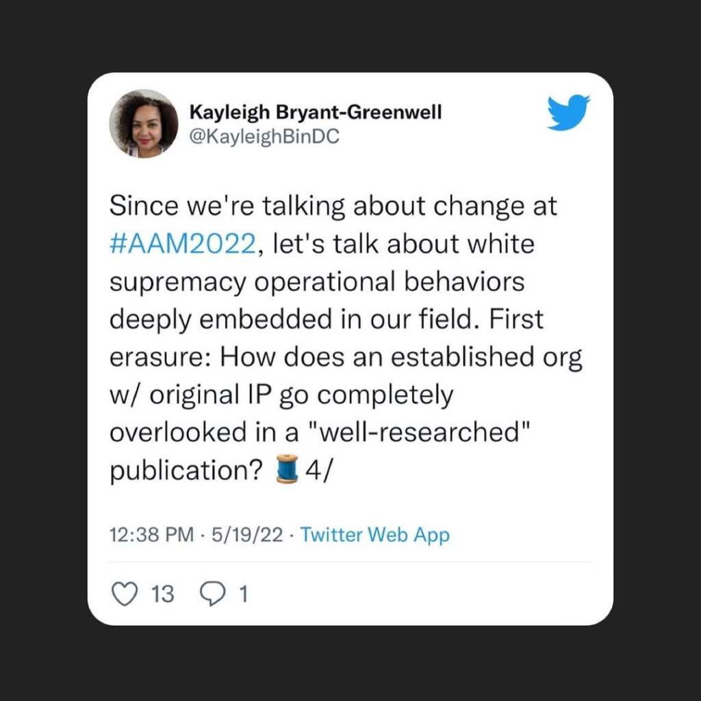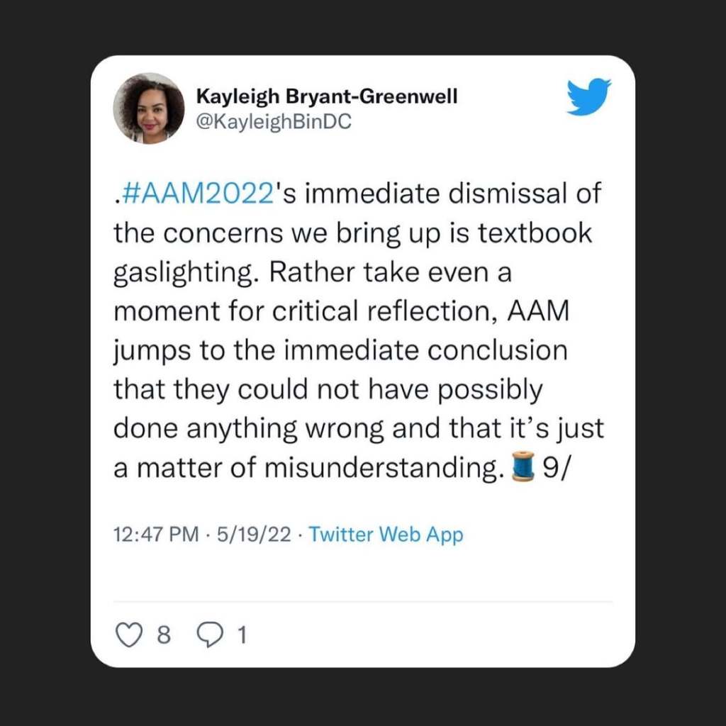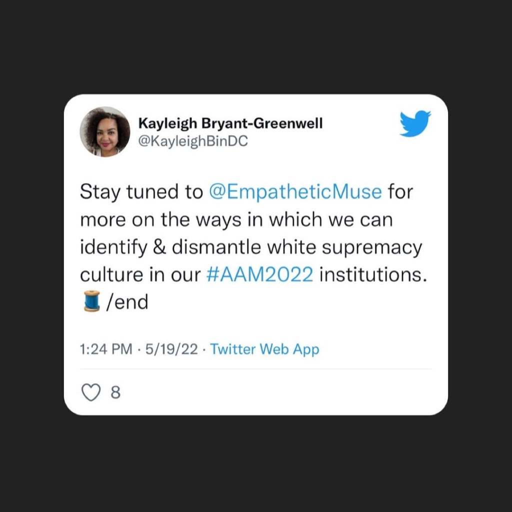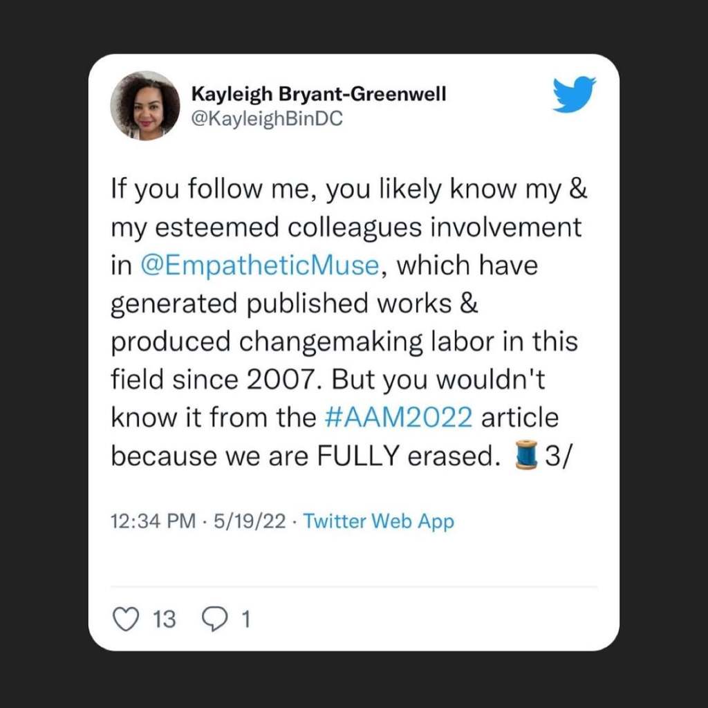 The Empathetic Museum. [@empatheticmuseum] (May 19, 2022). “Thank you to our member, @kayleighbindc, for so eloquently calling out the harmful behavior of organizations like @aamersofficial that seek to erase, gaslight and detract from original work” [10 Image Slideshow]. Instagram. https://www.instagram.com/empatheticmuseum/p/CdwAtVAPAT4/?img_index=1