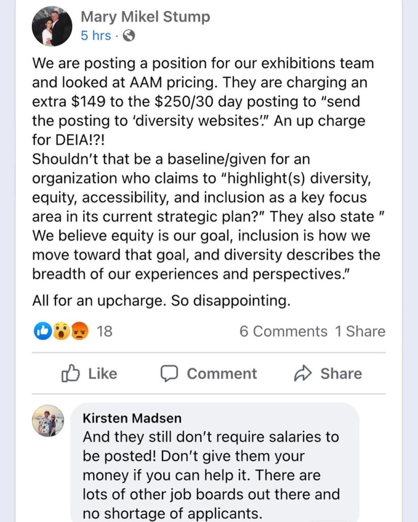 This thread (1-3) from @msquaredstump Facebook account reveals that AAM is charging extra to post to ‘diversity websites’.” It’s ironic that an organization who just released a report on ‘Excellence in DEAI’ is up charging folks to help accomplish this mission. Are we missing something here? @aamersofficial @name_aam.